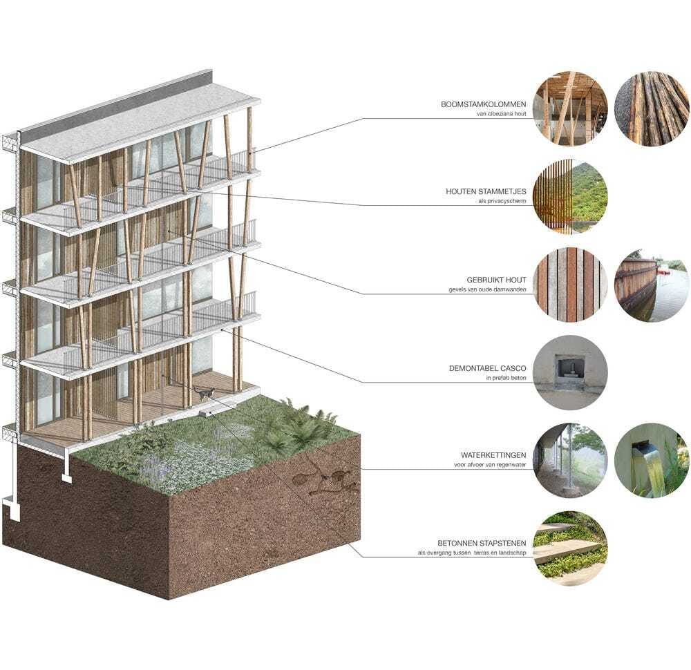 ☼ Tree trunks animate the facade of demountable Forest Bath housing in Eindhoven. The design is inspired by the Japanese practice shinrin-yoku, in which you immerse yourself in the forest, taking in nature using all your senses to calm your body and mind," said GAAGA.